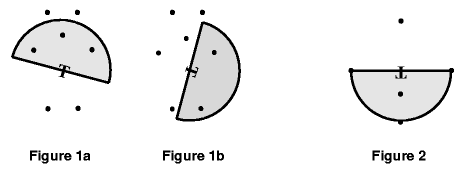 A transmitter T is located somewhere on a 1,000 square meter grid. It broadcasts in a semicircular area of radius r. The transmitter may be rotated any amount, but not moved. Given N points anywhere on the grid, compute the maximum number of points that can be simultaneously reached by the transmitter's signal. Figure 1 shows the same data points with two different transmitter rotations.